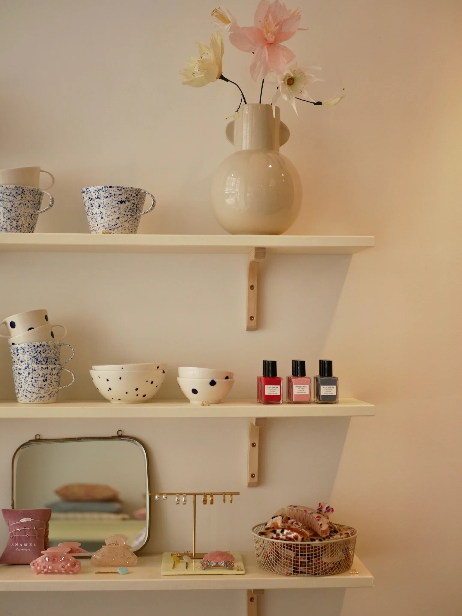 Butikken er et lille eventyr for sig, med mulighed for at gå på oplevelse blandt de fine smykker fra ENAMEL Copenhagen, håraccessories, keramik fra svenske Ann-Louise Roman, boliginteriør og blomster.